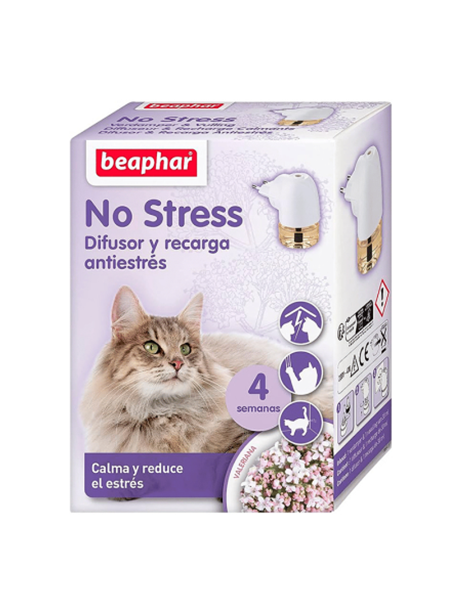 Descripción: El Difusor No Stress es la solución conveniente para calmar a los gatos. Este difusor eléctrico dispensa extractos naturales de valeriana y lavandina, reconocidos por sus propiedades calmantes en los gatos. Una recarga (30 ml) reduce el estrés y el comportamiento no deseado en gatos de todas las edades y razas durante aproximadamente 4 semanas. Calma a los gatos durante eventos estresantes como la llegada de una nueva mascota, mudanzas, tormentas eléctricas o fuegos artificiales. Beaphar No Stress reduce problemas de comportamiento como maullidos excesivos, vandalismo, marcaje territorial o dificultades para convivir con otros animales. Adecuado para un área de hasta 50m².