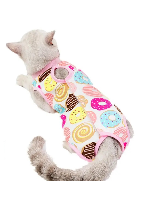 BODY POST OPERATORIO PARA GATO TALLA M CON DISEÑO DE DONUTS, adorable body con un original diseño que se adapta perfectamente a la anatomía de tu gato con una correcta selección de la talla, es de una tela cómoda, suave al tacto y transpirable. Es una excelente solución post operatorias en gatos, reemplaza al collar isabelino y es perfecto para prevenir infecciones o heridas causadas por tu gato al lamerse, por lo que contribuye a la adecuada cicatrización.