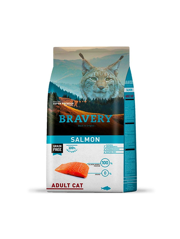 BRAVERY SALMON ADULT CAT 7 KG, alimento para gatos adultos, es ideal para gatos de todos los tamaños y razas a partir del año de edad. Elaborado con 100% carne de salmón deshidratada, es libre de granos y gluten, no contiene colorantes, saborizantes ni conservantes artificiales. Está formulado para gatos con sensibilidades, alergias o intolerancias, es hipoalergénico y monoproteico. Además, ayuda a asegurar un crecimiento armonioso, un sistema inmunológico eficiente y una vitalidad plena de tu gato.
