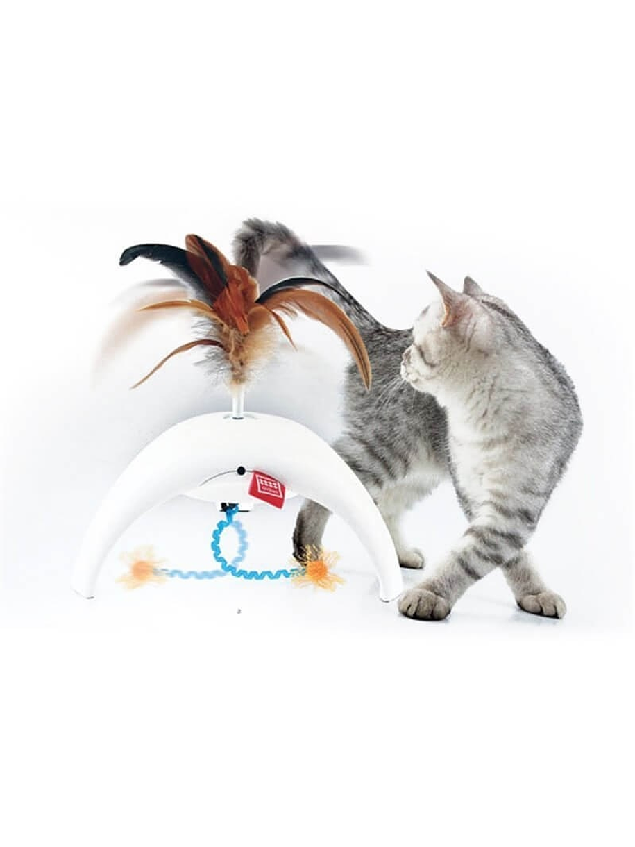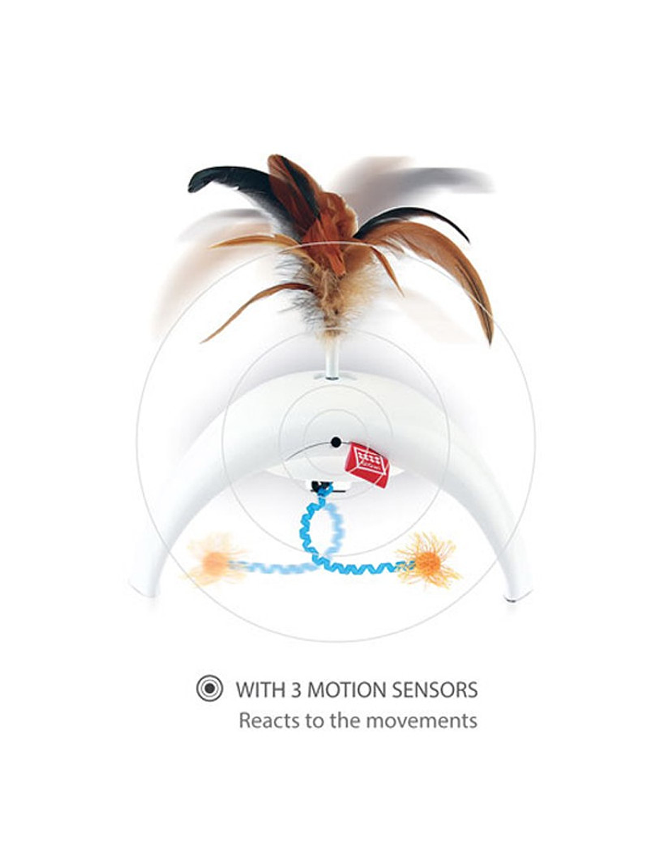 Juguete interactivo para gatos que se activa con el movimiento. Equipado con tres sensores de movimiento diferentes, este juguete evita puntos ciegos y activa mecanismos giratorios bidireccionales con plumas para proporcionar horas de entretenimiento.