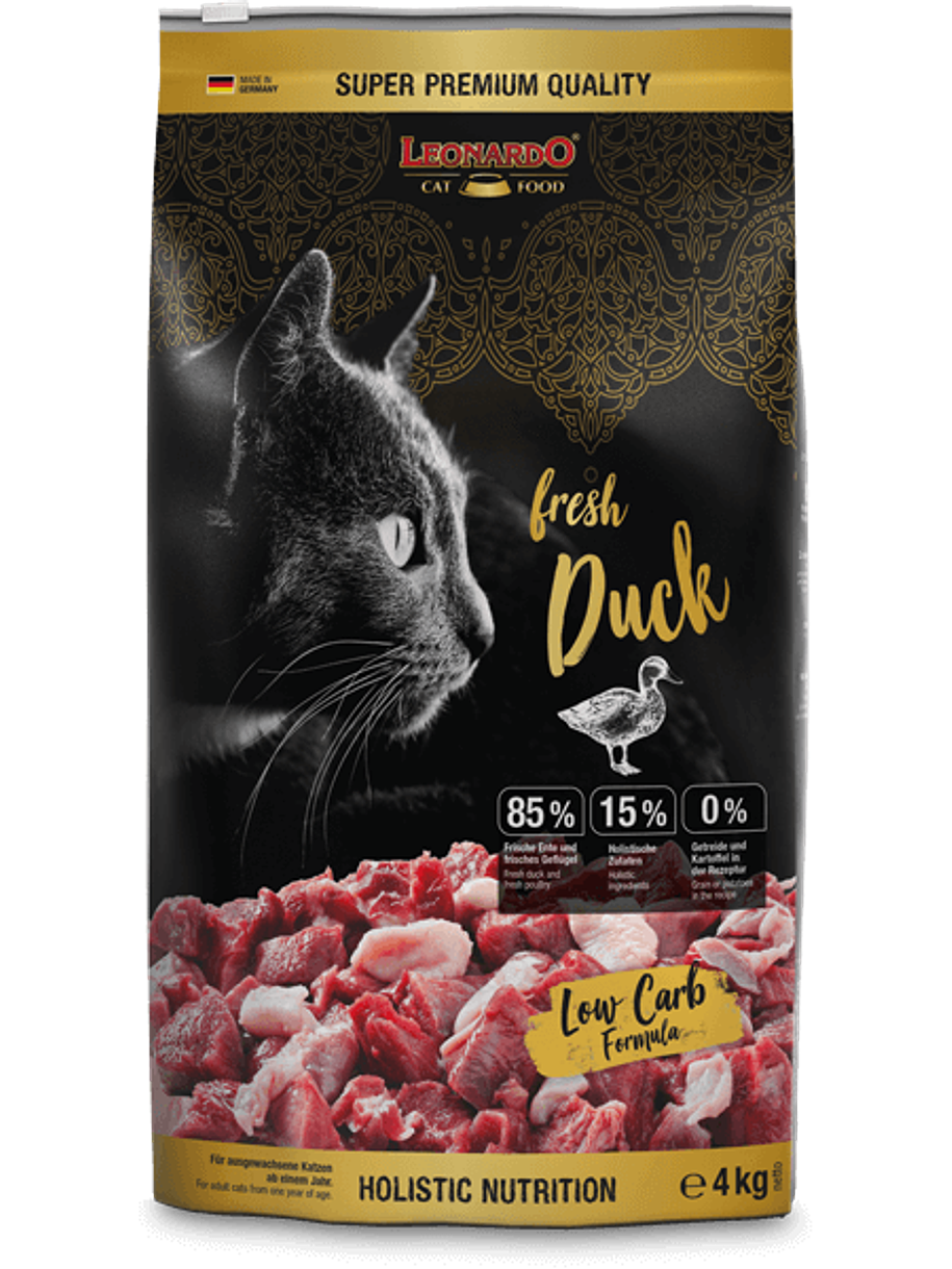 LEONARDO® Adult Fresh Pato para gatos adultos, es un alimento que contiene un 85% de pato y ave fresca, 15% de ingredientes holísticos y no contiene cereales y patatas en la receta. Además, sus ingredientes refuerzan las defensas de tu gato con beta-glucanos procedentes de levadura de cerveza, ayuda a la higiene dental, reduciendo la placa bacteriana y favorece la digestión, con mucílago natural y un 20% de ácidos grasos omega-3.