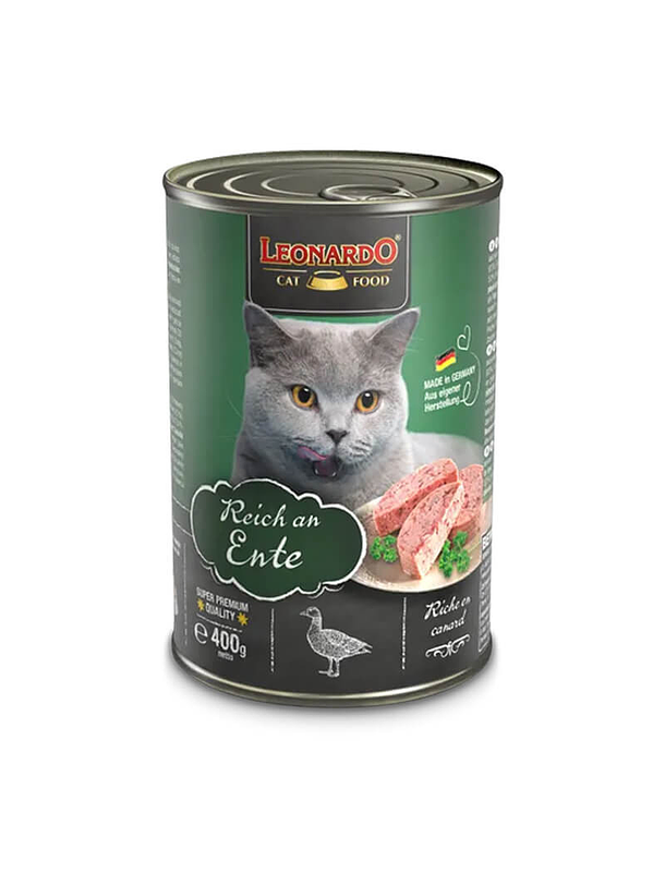 LEONARDO® Quality Selection Pato es un alimento húmedo indicado para gatos adultos rico en pato. En su fórmula solamente se utilizan productos cárnicos frescos. Gracias a la alta disponibilidad biológica y a la alta calidad de estos productos, tu gato necesita una cantidad relativamente pequeña para satisfacer sus necesidades nutricionales diarias.