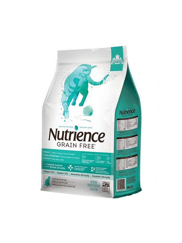 NUTRIENCE LIBRE DE GRANOS INDOOR, DE PAVO, POLLO Y PATO, 2.5 KG para gatos en todas las etapas de la vida y todas las razas, con una formulación baja en grasa. Se adapta especialmente a gatos de interior que tienen una vida sedentaria, con baja actividad física y que requieren una dieta libre de granos y gluten. Esta receta contiene múltiples fuentes de proteína magra premium, que brindan un perfil completo de aminoácidos esenciales para la salud general y el crecimiento de su gato, a la vez que lo mantienen en forma. Contiene carbohidratos de bajo índice glucémico, seleccionados por su alto valor nutricional, que contribuyen a la disminución en la liberación de glucosa en el torrente sanguíneo, reduciendo el riesgo de diabetes y ayudando a prevenir la obesidad. Además, contiene aceite de coco, extracto de piña y fibra de psyllium que reducen la formación de bolas de pelo y facilitan el tránsito intestinal.