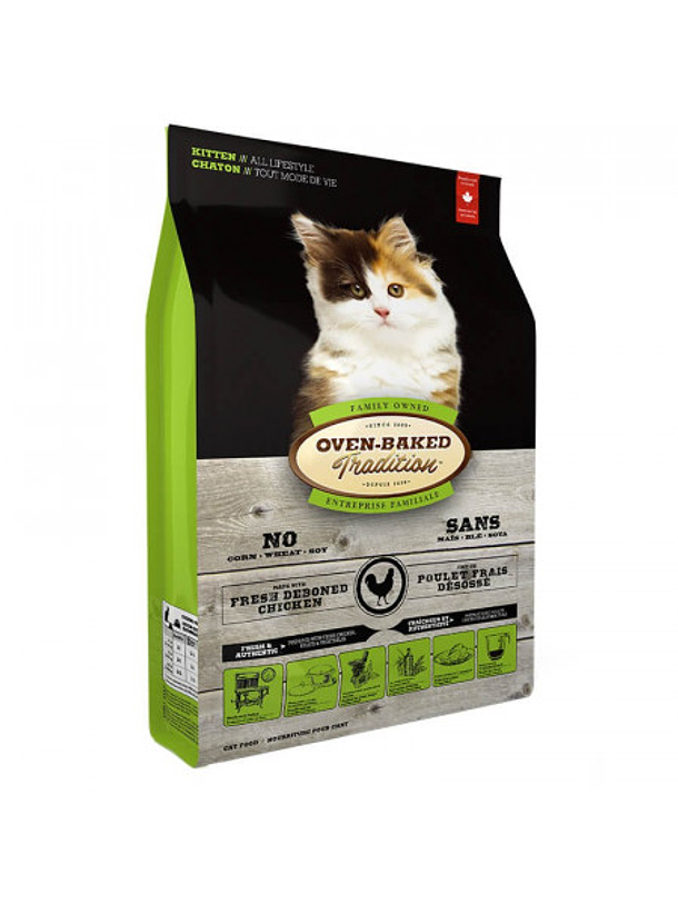 OVEN BAKED TRADITION DE POLLO FRESCO DESHUESADO 2,27 KG que contiene pollo fresco, frutas, verduras, contiene cereales integrales molidos y no contiene saborizantes ni conservantes artificiales. Ha sido formulado para gatitos y está perfectamente equilibrado, proporcionando un desarrollo ideal.