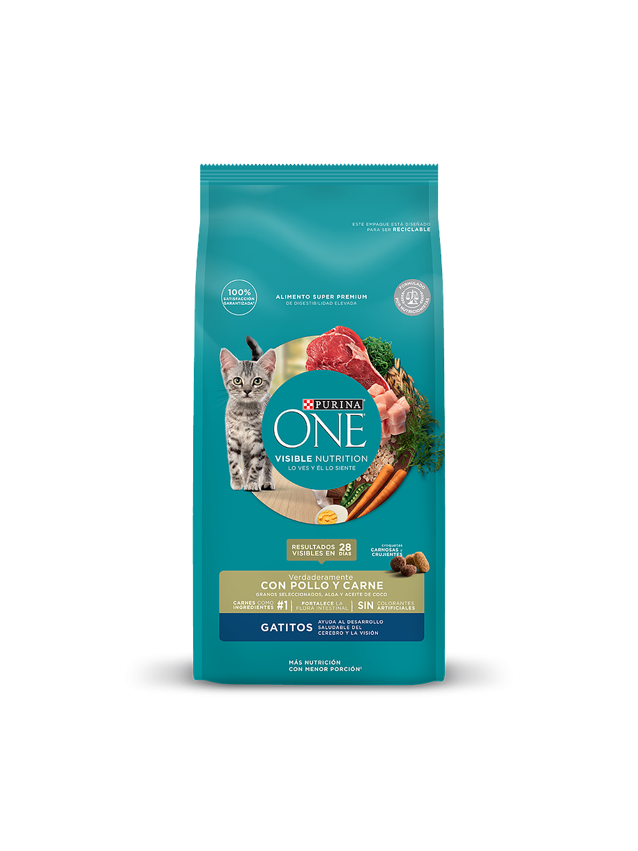 PURINA ONE para gatitos con pollo y carne 2KG, alimento seco para gatitos y hembras gestantes/lactantes. Su receta contiene carnes, granos seleccionados, aceite de coco como fuente alternativa de energía, algas y harina de pescado que son ricas en omega-3 (DHA) para ayudar al desarrollo saludable del cerebro y visión de tu gatito. Está formulado con probióticos naturales que fortalecen la flora intestinal y garantizan una mejor digestión y, además, no contiene colorantes artificiales